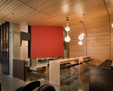 The bar and built-in furnishings are custom designed of dark-stained plywood and blackened steel. Slotted plywood tables also designed by the architects complement a range of seating types from traditional bar and café to casual lounge seating. Wall colors chosen from a palette developed by the client range from bright red to deep burgundy and charcoal grey. Existing polished concrete floors were left exposed throughout. A small prep kitchen and new restrooms were added behind the bar.