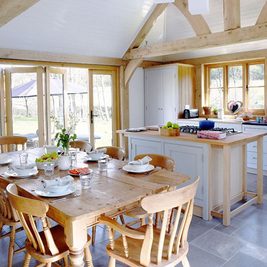 Avoid the temptation to cram as many units into the room as possible as this will make the kitchen feel smaller. Classic wall-mounted plate racks are an ideal way to keep a country kitchen tidy.