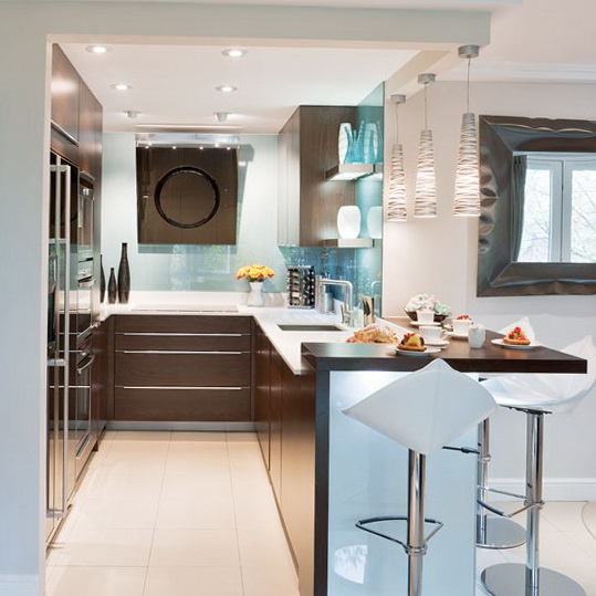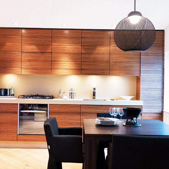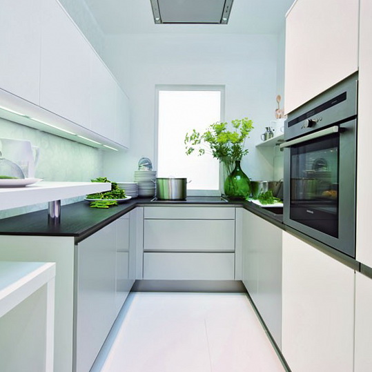 Recessed handles make for a streamlined design and will stop clothes catching on doors where space is tight, while reflective finishes such as mirrored-glass splashbacks, hi-gloss cabinetry and stainless-steel appliances are effective in kitchens that lack natural daylight.