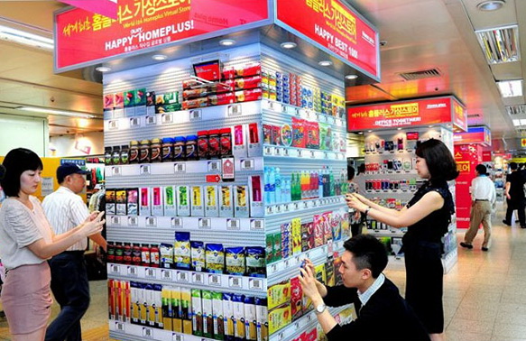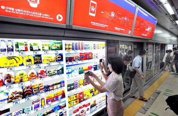 Android owners, take heed: no more waiting in epic lines at the market to pick up the day’s staples. From milk and juice and toilet paper to choice cuts of your favorite meat, South Korea’s Homeplus has got you covered. The country’s #2 discount chain has designed the coolest multitasking app that will simplify the mundane and oft annoying necessity of shopping for food and toiletries. Say you’re waiting for your train at Seoul’s crazy-busy Seolleung train station, and you have a few moments to kill, but your day is already jam-packed with meetings and you don’t know when you’re going to get to the store to buy stuff for dinner. Homeplus to the rescue! Simply pull out your handy-dandy smartphone, download the Homeplus shopping app, peruse the life-sized “wallpaper” of goods carried in Homeplus stores, scan the respective barcode for the item you wish to purchase, and voila! Your selections will be delivered directly to your home or office later in the day. Apple’s iPhone is not yet compatible, which is ironic: you cannot yet use your Apple to buy an apple. Someday soon, perhaps.