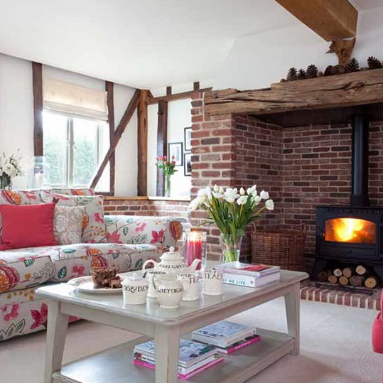 An inglenook fireplace takes pride of place in this traditional living room. A bright floral sofa keeps the look up to date, while the exposed beams and brickwork give the room a grand country-cottage feel.