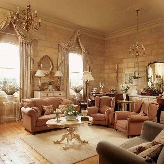 The high ceilings in this room make it perfect for daring orange walls. Ornate candelabra, frilled sofas, heavy curtains and a striking walnut coffee table increase the sense of drama and occasion.