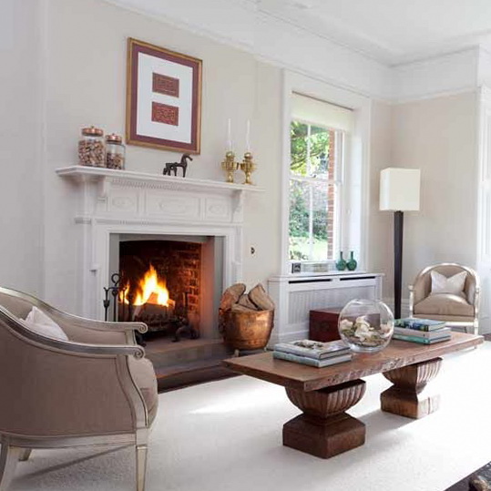 A neutral colour scheme creates the perfect backdrop for a mixture of eclectic objects to stand out in this living room. The fireplace creates a traditional focal point, while the furniture is a mix of classic styling and more quirky pieces. Jars of corks are used as unusual accessories on the mantelpiece.