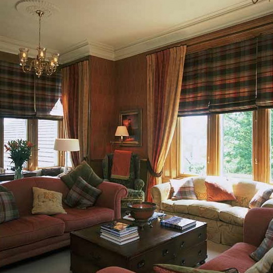 Add some Highland charm to your living room with plaid blinds, thick drapes and plenty of comfy cushions for snuggling up in front of the fire on cold Scottish evenings. Rich wallpaper and a classic chandelier complete the look.