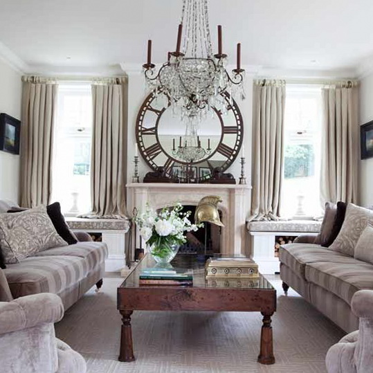This stunning living room sticks to a muted colour scheme of taupe and beige, but is brought to life with the addition of a grand chandelier and a statement clock-shaped mirror.