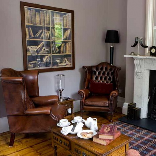Chesterfield armchairs facing one another by the fire make this the perfect place to ruminate on world affairs - or perhaps just enjoy a brandy. The violet walls add warmth to the room, as does the checked rug.