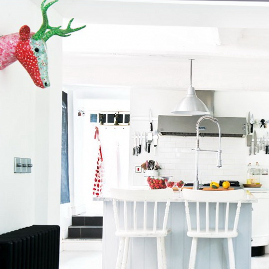 White on white keeps this kitchen looking bright, clean and fresh. The rest of the scheme is accessorised with quirky pieces and bold shots of colour to avoid creating an overwhelming, sterile look. We love the colourful stag on the wall.
