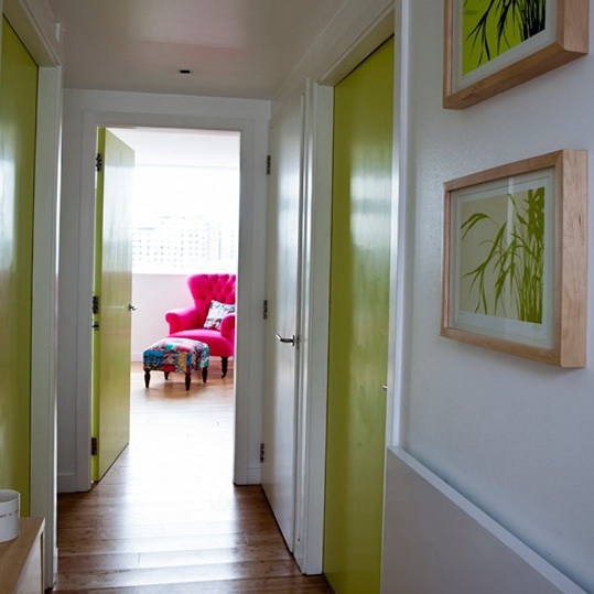 Paint the doors leading from your hallway a bright colour to add interest, especially if your hall is more of a corridor than room. Choose a zesty green paint for a fresh look, that works brilliantly with wooden flooring.