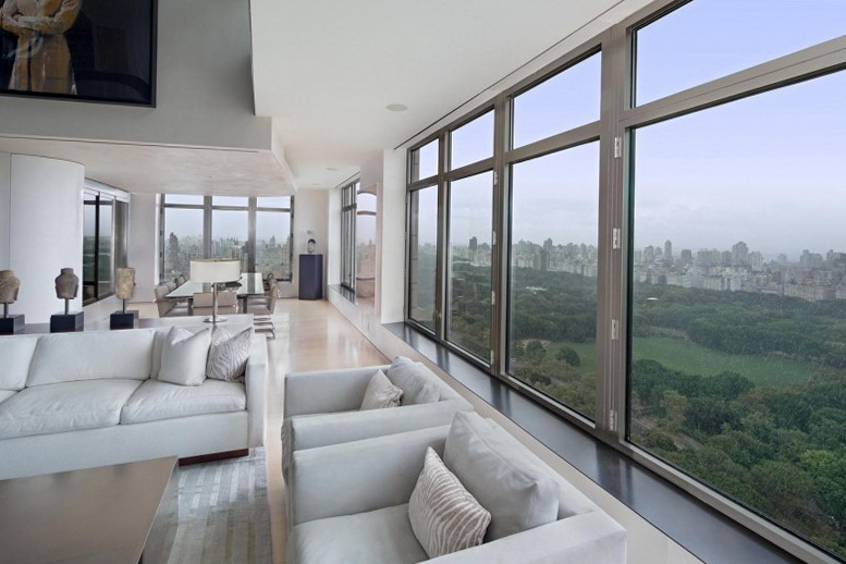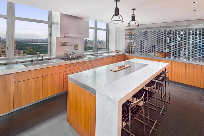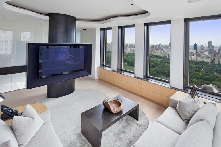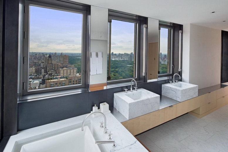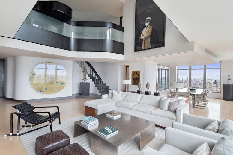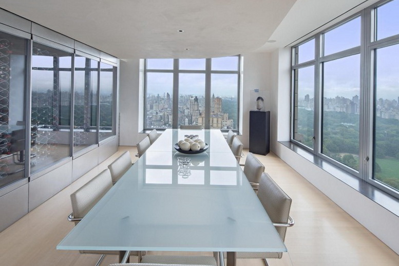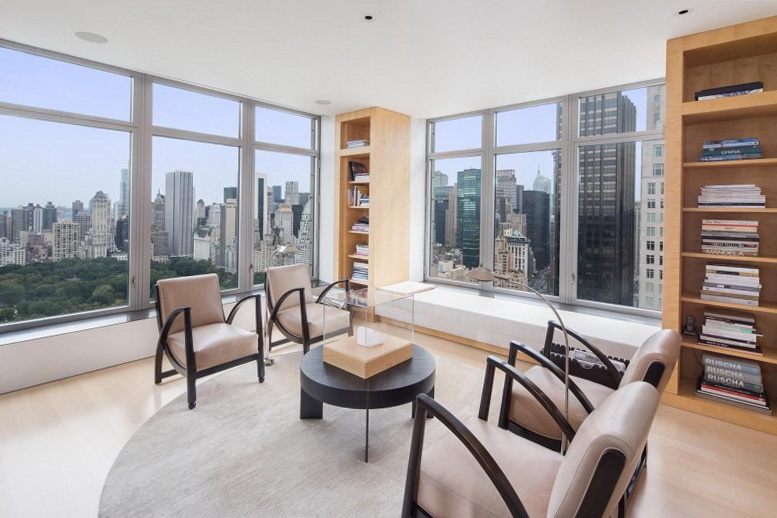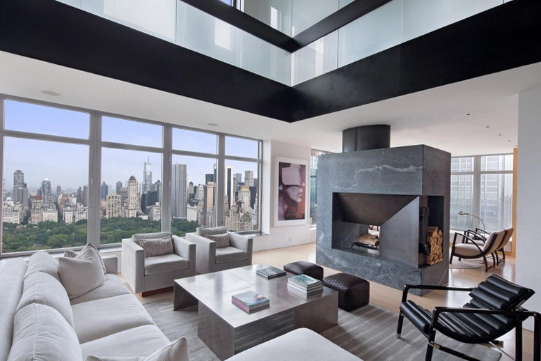 Located on the top two floors of the building, the five bedroom, five and a half bath apartment offers breathtaking 360 degree views Central Park and the city’s skyline.
