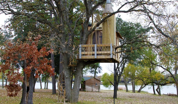 To be safe, the house can be hung on ropes attached to the branches, or call into the base, additional support piles.