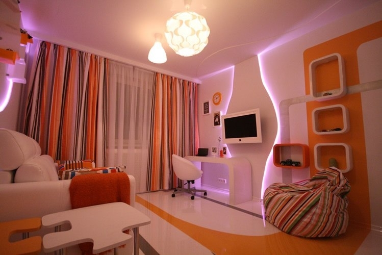 The unusual design of the walls, bright furniture and stylish decor elements from a small apartment in a modern studio.