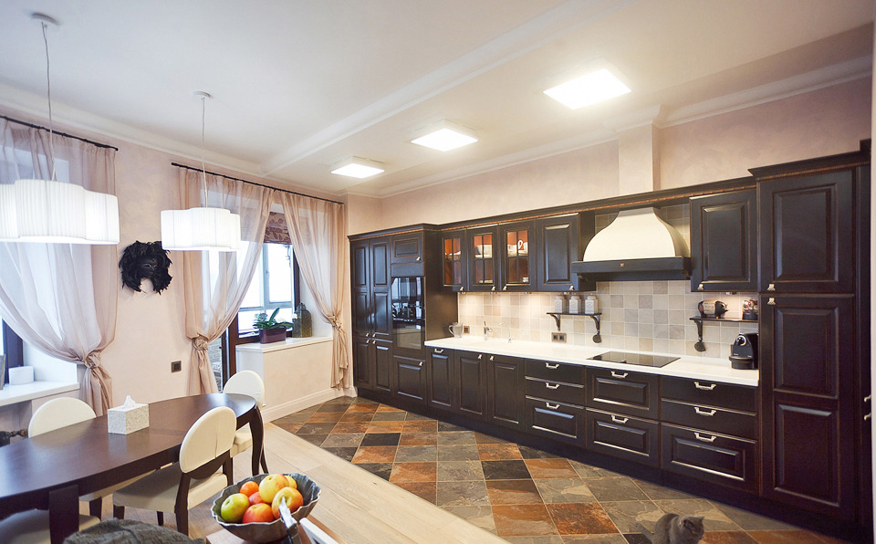 Maxim’s cabinet is of classical style. The pictures were painted by Mariya’s grandfather, a geologist, travelling about the whole Soviet Union. Some works did not survive due to a poor quality of paints and complex camp conditions of life, the rest of them had been in Vorkuta for a long time until the uncle brought them from there. A sofa is Home Cоncept, a table with alcoholic drinks is Villeroy & Boch, a rack is made to order.