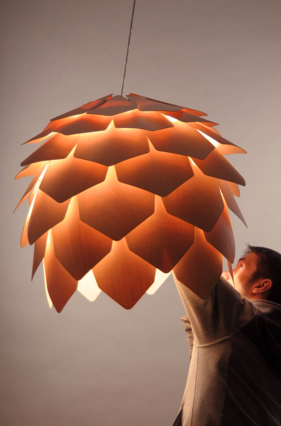 Designer Pavel Eekra created light “Crimean pine cone.” It consists of 56 one and a half thick plates and screws, and are not required for the assembly of additional items. The plates are made of natural wood veneer, beech or maple, thus symbolizing the merger of industrial design and nature. Lamp gives the room a soft glow and comes unassembled.