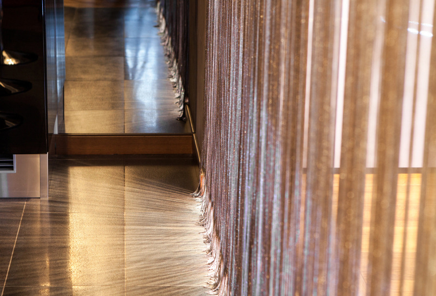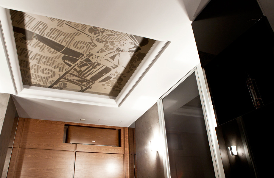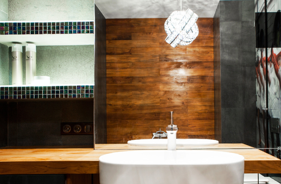 Neutral grey was chosen as a basic color. It is completed by addition of other patterns: glass, mirrors, ceramic granite, teak, mosaic. Finishing of entry elements including air conditioner is in harmony with teak in the bathroom. Liza Minnelli welcoming the guests at the entrance sets further aesthetics in cabaret spirit at once.