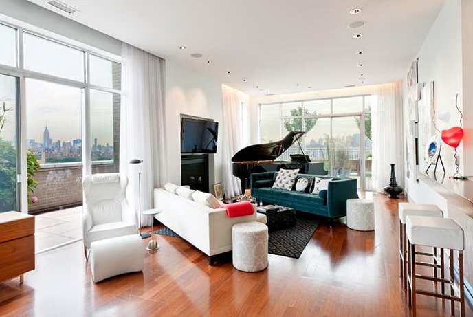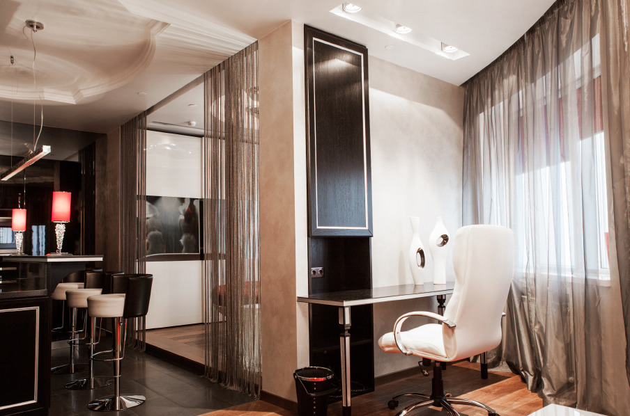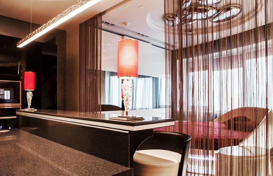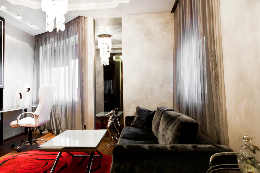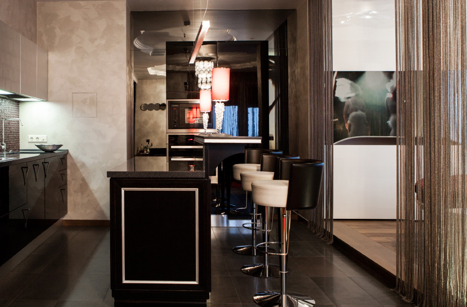 Notwithstanding that the apartment is located on the 32nd floor of a new building, difficulties occurred with a free layout and walls: the space was broken and geometric. The owners wanted to leave as much open space as possible at a small metric area. So, an idea of a studio with a well thought-out zoning appeared. An artistic constituent was predetermined by the hostess’ love for Paris. By the designer’s idea this city in the interior is symbolized not by the typical Eiffel Tower and Arc de Triomphe, but a cabaret.
