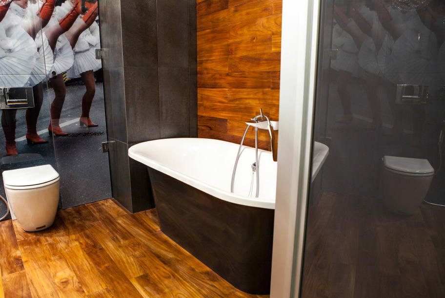 There is a bathroom to the right of the entrance door. Natural teak is used in the floor and walls finishing in it. Plenty of mirrors, glass, and other reflecting surfaces not only extend the space visually but have a functional purpose: there are wardrobes and utility sections behind many of them.