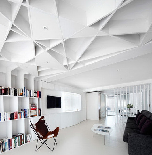 There is a library in the right part of the apartment, where the second level was overbuilt like in children’s rooms.