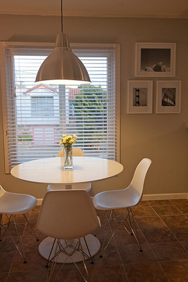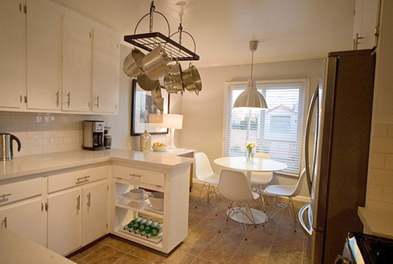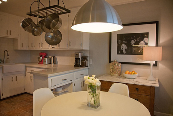 Add your personal tough in the field of design of the white kitchen with interesting accessories as the lamp, hours, a work of art and a collection of plates, ceramics and glass. There are many ways to add an interior of white kitchen and to make it not such boring. Use other textures and other color for giving some depth and interest to the space. Photos with light and dark frameworks look great in the interior of this kitchen. Table and chairs are white and have an interesting form. They are looking elegantly and originally. The wooden bureau suits the white interior great.