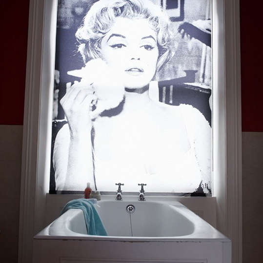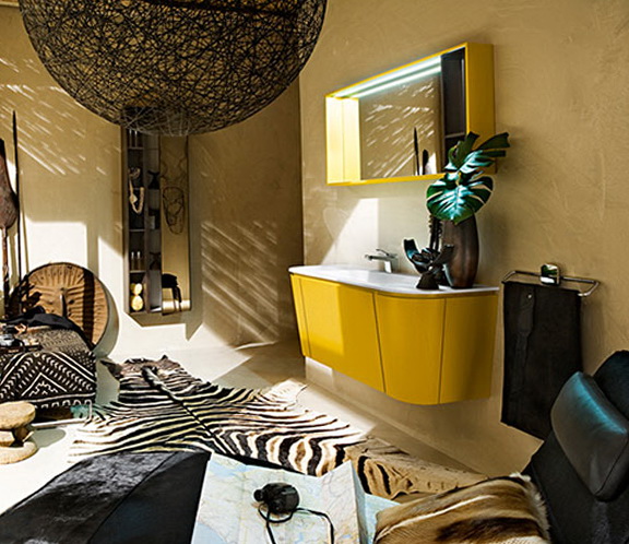 Yellow wash rounded brightens up all the pathos of the rest of the bathroom: darkened corners, zebra on the floor and black textiles create a mystery, almost surreal landscape.