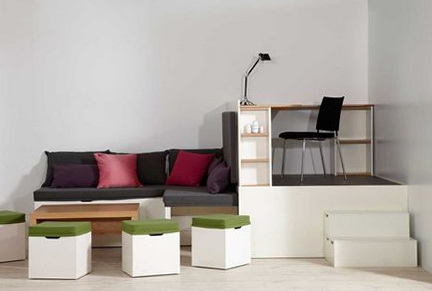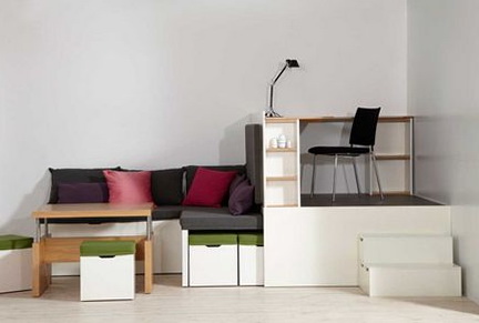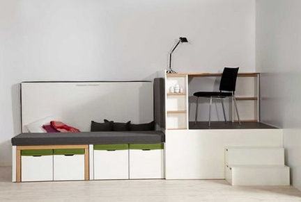 bed and work table in one , bedroom and living room in one , living room bedroom