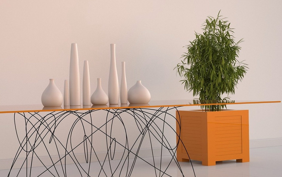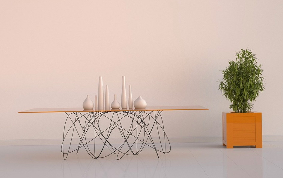 A table made by American designer Jason Phillips, this dining table has a very unusual design. The inspiration was the quantum physics, and instead of simple interpretation of the movement of the legs to observe subatomic particles of steel wire. The very Fine countertop is made of wood and covered with clear varnish.